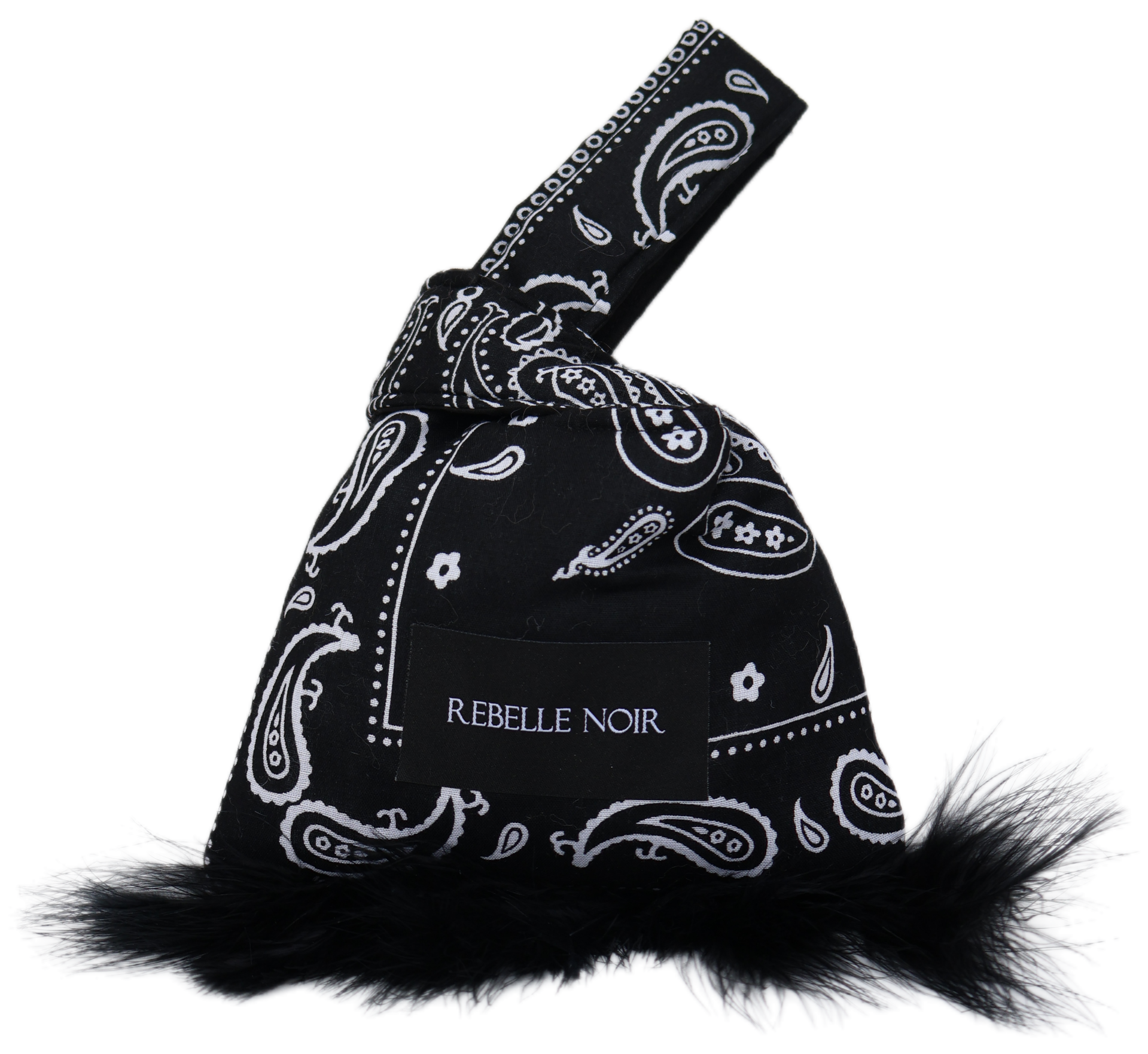 The Knot – Paisley is een compact tasje gemaakt van een zwarte bandanastof met een wit paisleypatroon. Het model sluit door één hengsel door het andere te halen, waardoor de kenmerkende ‘knot’-vorm ontstaat.